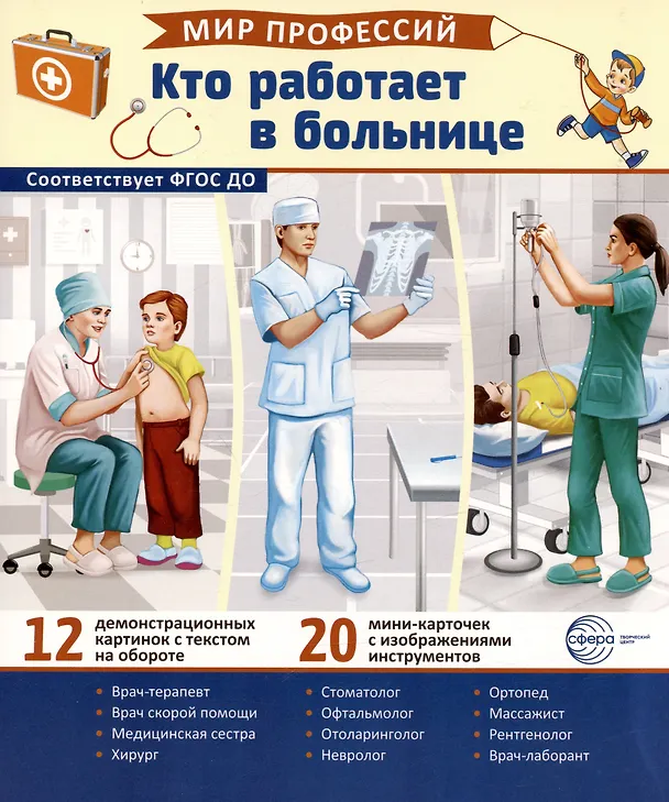 Демонстрационные картинки. Мир профессий. Кто работает в больнице (12 картинок + 20 разрезных мини-карточек)
