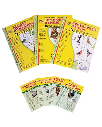 Демонстрационные картинки СУПЕР. Птицы: перелетные, зимующие, домашние (комплект из 3-х наглядных материалов в папках + 4 набора карточек)