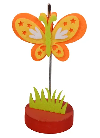 Держатель для визиток «Бабочка со звездочками» станет не только прекрасным декоративным украшением стола, но и послужит функционально. Вместо визиток можно крепить фотографии. Поместите в держатель вашу любимую фотографию, и она будет радовать вас каждый день, напоминая о приятных мгновениях. Держатель выполнен из фетра. Такой сувенир, несомненно, доставит море положительных эмоций своему обладателю. Размер держателя: 11х4х6,7см.
