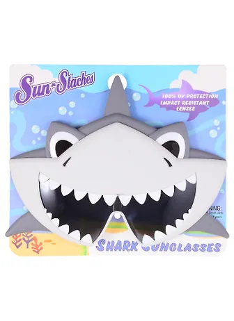 Широкая оправа детских солнцезащитных очков «Акула» выполнена в виде открытой зубастой пасти акулы. 100% защита от ультрафиолета UV400. Ударопрочные линзы.