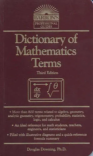 This quick-reference dictionary for math students, teachers, engineers, and statisticians defines more than 800 terms related to algebra, geometry, analytic geometry, trigonometry, probability, statistics, logic, and calculus. It also lists and defines mathematical symbols, includes a brief table of integrals, and describes how to derive key theorems. It is filled with illustrative diagrams and equations.