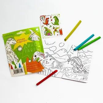 Открывайте блестящую яркую упаковку, чтобы отправиться в путешествие в мир Юрского периода, забавные динозавры живут здесь своей жизнью, осталось только их раскрасить! В наборе есть восковые карандаши и наклейки.