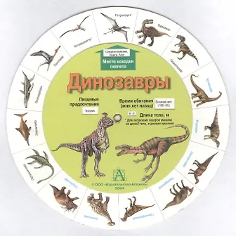 Вашему вниманию представлена удобная круглая таблица, которая включает в себя разные виды динозавров.