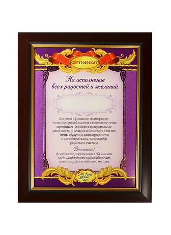 Диплом в рамке На исполнение радости и желаний (17,3х22,4) (871014)