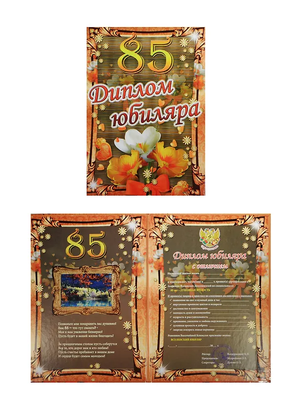Диплом Юбиляра 85 лет. Диплом юбиляра - отличный подарок, как сам по себе, так и как дополнение к основному подарку. Диплом имеет оригинальную вклейку с поздравлением юбиляру. Подарок юбиляру.Размер 150х210 мм. (300х210 мм. в развороте)