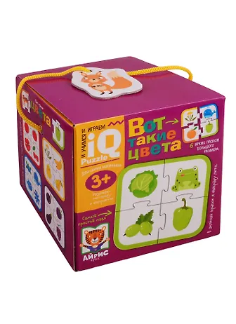 Пазлы «Вот такие цвета» – это увлекательная настольная игра, в которой ребёнок познакомится с шестью основными цветами: красным, оранжевым, жёлтым, зелёным, синим и фиолетовым. Задача - сложить шесть пазлов разного цвета. Каждый пазл состоит из четырёх картинок, на которых изображены животные, растения и предметы. Внутри есть подробное описание правил игры.