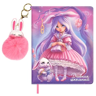 Дневник школьный арт. 66400 / 15 АЛИСА (кожзам: А5+; твёрдый переплёт с поролоном, материал обложки: искусственная кожа "Наппа"; декор: полноцветная печать; способ крепления блока: ниткошвейный; вн. блок: 48 л., белый офсет 80 г/м², печать в одну краску, справочный материал: универсальная шпаргалка; закладка: одно ляссе; форзац: печать в одну краску; особенности: брелок из искусственного меха в комплекте; индивидуальная упаковка: ПЭТ-пакет)