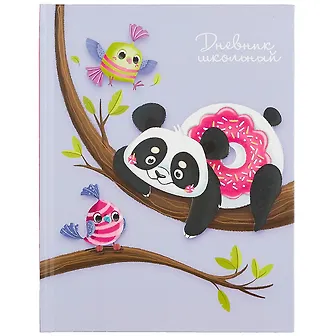 Панда на дереве. Яркий дневничок для школы . Фиолетовый, изображено ещё деревья и птицы с пончиком в виде панды.Странички плотные, белые , четкая разметка. Советую брать для начальных классов. Соответствует всем параметрам которые нужны для дневника. Список для учителей, заметки, на последних страничках разметка для оценок. Стильный классный дневник, отличного качества!!!