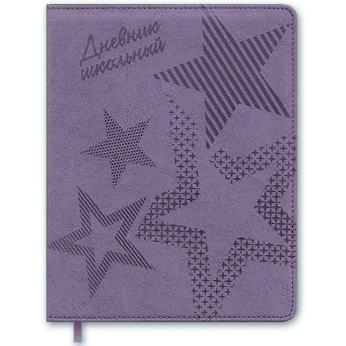 Дневник школьный Сиреневые звезды (А5+, 210х160, 96стр, обстрочка обложки по периметру, скруглённые углы обложки и блока, твёрдый переплёт с поролоном, белый офсет, 70, блинтовое тиснение, одна краска, ниткошвейный, закладка: одно ляссе, справочный материал, ПЭТ-пакет)