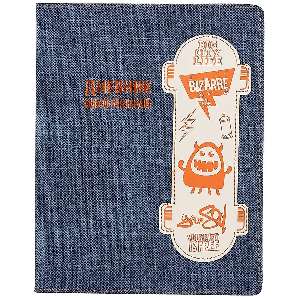 Дневник шк. арт.48562/15 СКЕЙТБОРД (А5+, 170x215, 96 стр., обстрочка обложки по периметру, твердый переплёт с поролоном, обложка:искусственная кожа , белый офсет, плотность бумаги 70 г/м2, аппликация из кожзама, блинтовое тиснение, одна краска, печать форзаца: одна краска, синий, нитко-швейный, закладка: одно ляссе, каптал: нет, спр. мат: универсальная шпаргалка, ПЭТ-пакет)