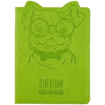 Дневник шк. арт.48554/15 СОБАКА (А5+, 170x215, 96 стр., обстрочка обложки по периметру, твердый переплёт с поролоном, обложка:искусственная кожа , белый офсет, 70, фигурная вырубка, блинтовое тиснение, одна краска, печать форзаца: одна краска, салатовый, нитко-швейный, закладка: одно ляссе, каптал: нет, спр. мат: универсальная шпаргалка, ПЭТ-пакет)