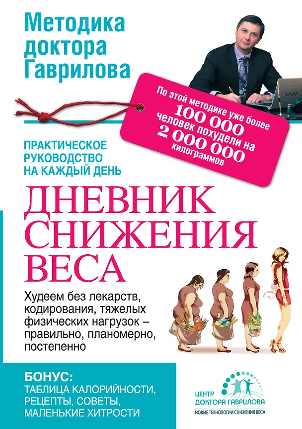 Дневник снижения веса по методу доктора Гаврилова - это не просто дневник питания. Это уникальный инструмент для правильного, планомерного, последовательного контроля своих привычек питания, питьевого режима, приема поливитаминных и других препаратов, а также наблюдение за своими психологическими аспектами, имеющими прямое отношение к правильному пищевому поведению. Доказано, что люди, ведущие дневник, быстрее формируют новые полезные пищевые привычки, лучше справляются с хроническими стрессами и быстрее достигают своих целей. Дневник предназначен как для людей, которые прошли программу снижения веса по методу доктора Гаврилова, так и для самостоятельного снижения веса.