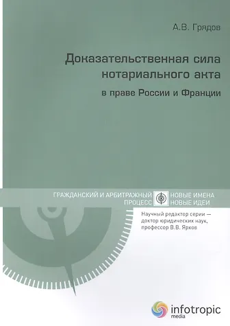 Настоящее издание - первое отдельное комплексное сравнительно-правовое исследование, посвященное доказательственной силе нотариального акта в праве России и Франции. Книга актуальна в свете необходимости реформирования института нотариата: расширения полномочий нотариусов, повышения требований к нотариусу и наделения результатов его деятельности, нотариальных актов, особыми свойствами. Автор проводит подробный анализ примеров из нотариальной и судебной практики по значимым проблемам в сфере гражданского процесса, международного частного права и международного гражданского процесса. Книга предназначена для нотариусов, судей, адвокатов, юристов организаций, участвующих во внешнеэкономической д