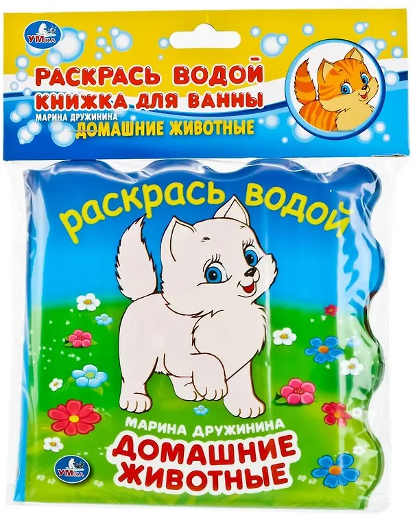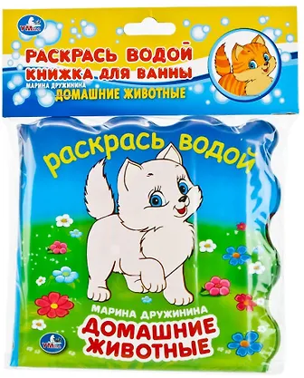 Книга для ванны "Домашние животные" - новое издание с сюрпризом ТМ "УМКА". Уникальность книжки в том, что после попадании в воду бесцветные изображения животных приобретают яркие цвета. Страницы непромокаемые, поэтому после попадания в воду книжка не пострадает. Раскраска превратит купание малыша в весёлую развивающую игру. Картинки сопровождают стихи замечательной детской писательницы Марины Дружининой. Книжка расширяет кругозор ребёнка, развивает речь, внимание и мышление.