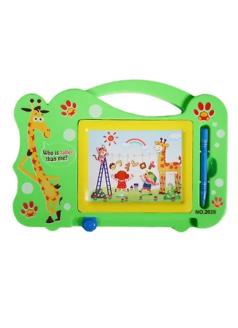 Цветная, яркая доска для рисования позволяет маленькому художнику создавать картинки, используя магнитную ручку. Благодаря специальному рычажку для очистки экрана, ребёнок может рисовать сколько угодно, не тратя бумагу. В комплект входят магнитные фигурки-печати. Эта игрушка очень компактна, поэтому её удобно брать с собой в дорогу или в гости.