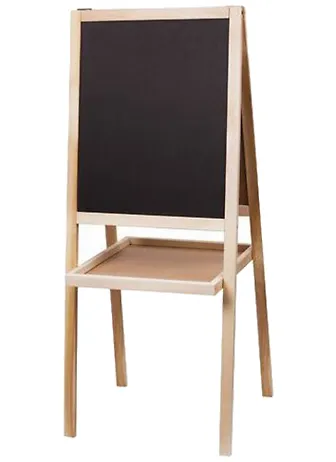 Мольберт имеет две стороны с разными поверхностями, можно рисовать мелом на чёрной стороне или использовать цветные маркеры на магнитной белой стороне.
