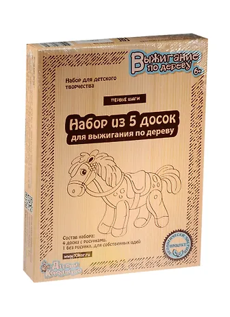 В этом наборе досок для выжигания собраны картинки для начинающих с простым и понятным ребенку сюжетом. Простые линии рисунков, как нельзя лучше подходят для тех, кто делает «первые шаги» в пирографии. Набор состоит из пяти досок, на четырех из которых нанесены простые картинки, а пятую мы оставили чистой для реализации своих идей. Размеры: 17x23x2,5 см.