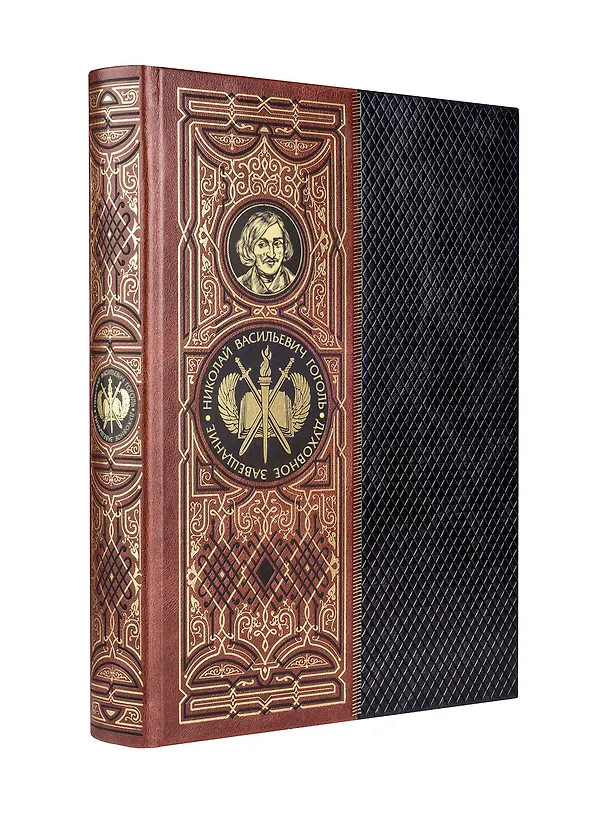 Книга в коллекционном инкрустированном переплете. Переплет изготовлен их двух видов натуральной кожи по технологии XIX века и украшен сплошным тончайшим тиснением, в полном соответствии с лучшими образцами переплетов европейских мастеров. В оформлении переплета использованы универсальные растительно-геометрические плетеные орнаменты, благодаря им книга будет отлично смотреться на любой книжной полке. На передней сторонке - гравированный портрет Николая Васильевича Гоголя. Лента для закладывания страниц и каптал, скрепляющий верх и низ объемного тома, изготовлены из шелка. Бумага в книге легкая, матовая, что обеспечивает комфортное чтение даже длительное время, иллюстрации напечатаны на высок