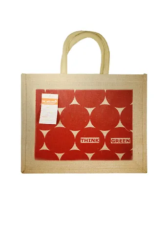 Ткань – из натурального джута, ламинированная, цвет – натурального джута (бежевый). Ручки – из хлопковой тесьмы, обшитой вокруг джутовой веревки, бежевые, длина ручек ― 36 см.