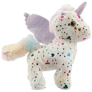 Забавный единорог, выглядит очень здорово и дети от него в восторге. Он устойчивый и хорошо стоит на полке, радуя взгляд. Игрушка хорошо сделана, довольно упругая, мягкая с пушистой гривой и хвостом. Благодаря блесткам красиво переливается на солнце. Но из-за белого цвета маркая, а стирать его страшно - вдруг блестки отвалятся.