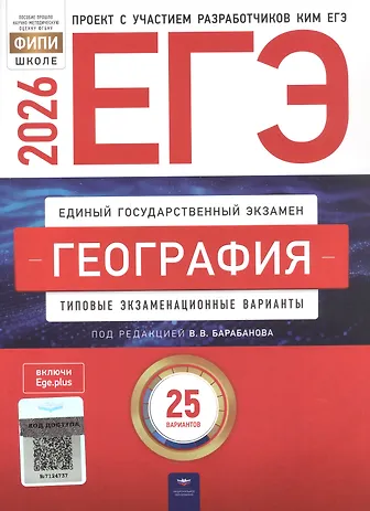 • 25 типовых экзаменационных вариантов, составленных в соответствии с проектом демоверсии КИМ ЕГЭ по географии 2026 года;