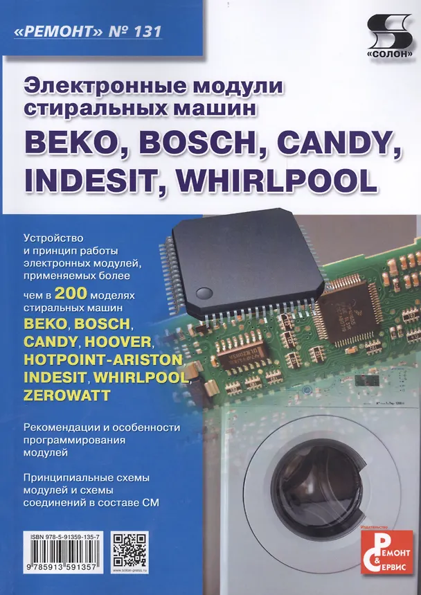 В этой книге рассматриваются электронные модули стиральных машин BEKO, CANDY/HOOVER/ZEROWATT, INDESIT/HOTPOINT-ARISTON, BOSCH, WHIRLPOOL (всего более 200 моделей СМ), относящихся к бюджетному и среднему классам. Помимо описания принципиальных схем модулей, характерных неисправностей и способов их устранения, даны материалы по взаимодействию основных цепей модулей с компонентами и узлами в составе СМ. Также в ней приводятся некоторые решения и рекомендации по программированию ЭМ. Книга будет полезна студентам профильных ВУЗов и колледжей, слушателям специализированных курсов повышения квалификации, специалистам по ремонту бытовой техники и читателям, имеющим базовые знания и необходимые практ