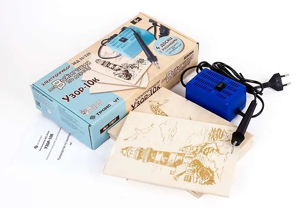 Набор для выжигания по дереву «Узор-10к», с двухступенчатым режимом нагрева и комплектом из 8 досок, размером 210х150 мм, что делает его идеальным для занятий на уроках труда, в кружках детского творчества и для занятия выжиганием по дереву дома. Четыре доски из них с рисунком и четыре чистые, для собственных идей.