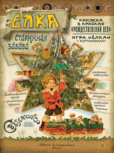 В роскошном картонном конверте с прозрачным окошком скрывается большая модель елки из необычайно прочного толстого лакированного картона, лист с фигурками для украшения этой елки, лото "Рождественская елка", которое маленькие подписчики журнала "Светлячок" получили вместе с декабрьским номером в 1911 году, а также книжка "Рождественский дед" - сказка в стихах, проиллюстрированная самим Б. В. Зворыкиным.