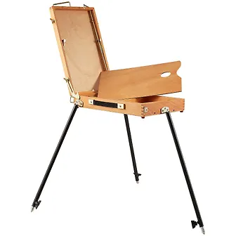Классический этюдник подходит для работы в любых условиях. Вертикальный держатель регулируется, максимальная высота металлических ножек 89,5 см.