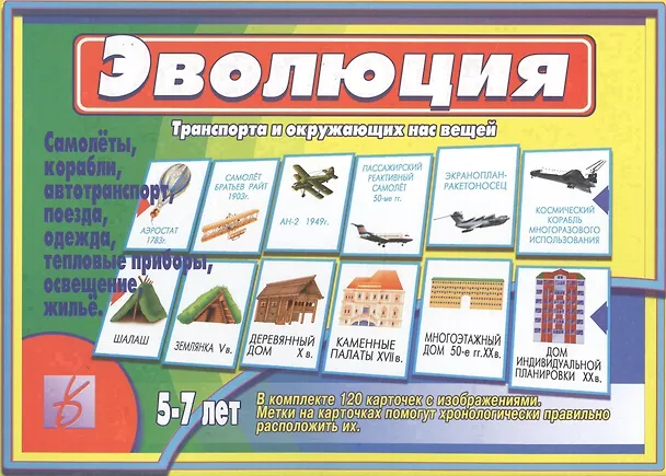 Игра предназначена для детей 5-9 лет и дает первое представление о техническом прогрессе. Эта игра познакомит с историей развития транспорта: наземного, водного, воздушного и историей обычных вещей: одежда, тепловые приборы, освещение, жильё.