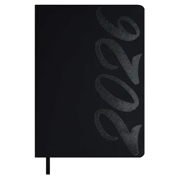 Ежедневник датированный 2026 ESCALADA, А5, 176 л., арт. 70232/ 15 СОФТ-ТАЧ ЧЁРНЫЙ (кожзам: 146х211 мм, твёрдый переплёт, материал обложки: искусственная кожа "Софт-тач"; декор: глиттер; способ крепления блока: ниткошвейный; вн. блок: 176 л., кремовый офсет 70 г/м², печать в две краски (клетка), справочный материал: есть; перфорация углов блока: нет; отделка среза: окрашивание пантоном; закладка/-и: одно ляссе; каптал: есть; форзац: печать пантоном; особенности: в блоке использованы мотивирующие высказывания из книги "Думай как миллиардер", помогающие сформировать правильное отношение к финансам, профессиональной деятельности, своим способностям и к жизни в целом; персонализация возможна: