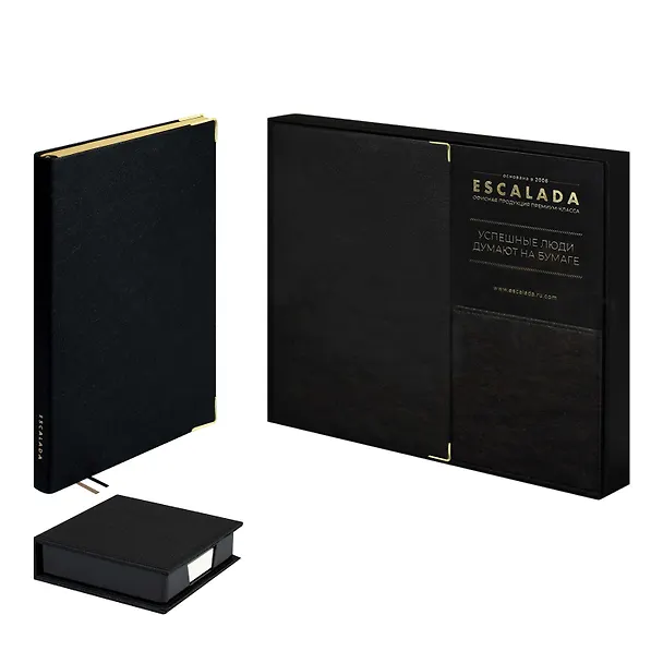 Ежедневник недатированный + подставка с блоком (набор подарочный) ESCALADA, А5, 160 л., арт. 70559/ 5 ШЕВРЕТ ГЛОСС ЧЁРНЫЙ (кожзам: ежедневника: 146х211 мм, подставки для блока: 107х107х28 мм, интегральный переплёт, материал обложки: искусственная кожа "Шеврет глосс"; способ крепления блока: ниткошвейный; декор: металлические уголки, тиснение фольгой; вн. блок: 160 л., белый офсет 70 г/м², печать в две краски (линия), справочный материал: есть; перфорация углов блока: нет; отделка среза: фольгирование; закладка/-и: два ляссе, каптал: есть; форзац: печать пантоном, персонализация возможна: да; индивидуальная упаковка: подарочная картонная коробка с ПВХ-крышкой + ПЭТ-пакет)