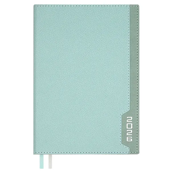 Ежедневник датированный 2026 ESCALADA, #ДУМАЙ КАК МИЛЛИАРДЕР, А5, 176 л., арт. 70237/ 15 ДЖУТ МЯТНЫЙ (кожзам: 146x211 мм, твёрдый переплёт, запаянный край, материал обложки: искусственная кожа "Джут"; декор: тиснение фольгой; способ крепления блока: ниткошвейный; вн. блок: 176 л., кремовый офсет 70 г/м², печать в две краски (линия), справочный материал: есть; перфорация углов блока: нет; закладка/-и: два ляссе; каптал: есть; форзац: печать пантоном; особенности: в блоке использованы мотивирующие высказывания из книги "Думай как миллиардер", помогающие сформировать правильное отношение к финансам, профессиональной деятельности, своим способностям и к жизни в целом, комбинированные материалы; персонализация возможна: да; индивидуальная упаковка: промостикер + ПЭТ-пакет)