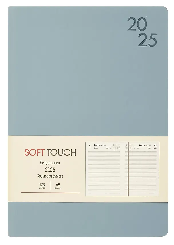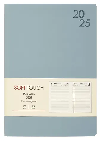 Ежедневник дат. 2025г. А5 176л "SOFT TOUCH" серый туман, интегр.переплет, иск.кожа, тонир.блок, скругл.углы, цв.торец, ляссе, инд.уп