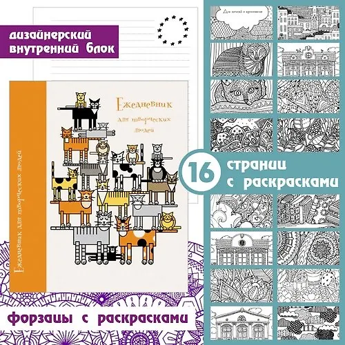 Творческий ежедневник А6+ (127х167). Недатир.,128 л. 7БЦ, матовая ламинация. Форзацы–с печатью (раскраска). Внутр.блок-дизайн.оформлен. Бум.- оф.70г/. Парад кошек (А6+, 128 л. Творческий-диз. блок).ЕЖТ18612803