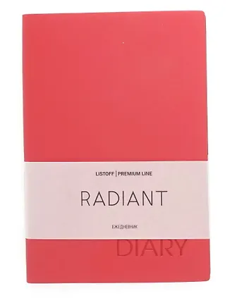 Недатированный ежедневник Listoff “Radiant” в твердой обложке, формата А5. Обложка выполнена в премиальной мягкой искусственной коже Soft-Touch с тиснением. Внутренний блок 152 листа высококачественной тонированной бумаги плотностью 80 г/м2, печать в 2 краски, ляссе. Дополнитальные разделы: личные данные, планирование проектов, важные даты, контакты, заметки.