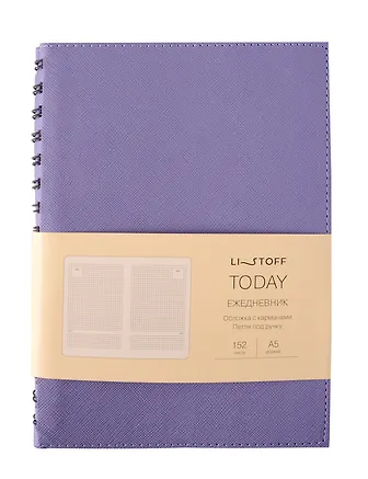 Недатированный ежедневник Listoff "Today" в интегральном переплете с евроспиралью, формата А5. Обложка выполнена в премиальной мягкой искусственной коже, а также имеет петлю для ручки, чтобы иметь ее под рукой и записать все важные мысли. Внутренний блок представлен 152 листами высококачественной белой бумаги плотностью 70 г/м2 в клетку.