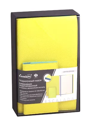 Купила я этот набор строго для подарка, так как товар уже аккуратно упакован в милой коробочке. Ежедневник кожаный, яркого лаймового оттенка, он недатированный и формат 5 А. Страницы внутри очень приятные, я бы сказала цвета слоновой кости 😍, также на них имеется специальные поля для указания даты. Наличие ляссе тоже очень приятно. А также ко всему этому, в этом наборе ещё есть обложка для паспорта, точно в таком же цвете, как и ежедневник. Рекомендую всем!!!