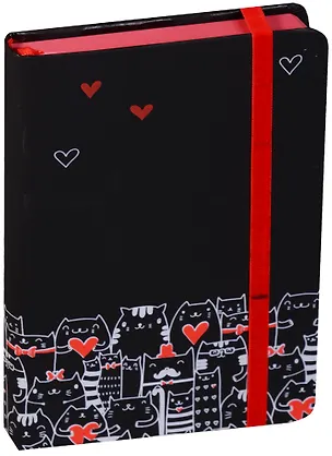 Ежедневник недат. арт. 45216/20 КОТЫ С СЕРДЕЧКАМИ "ЧЕРНЫЙ+КРАСНЫЙ СРЕЗ" (A6, 288 стр. белый офсет, 2-цветная запечатка дизайна. Тв. переплет , застежка-резинка, прямой корешок, закругл. углы переплета и внутр. блока, каптал, ляссе в цвет среза)