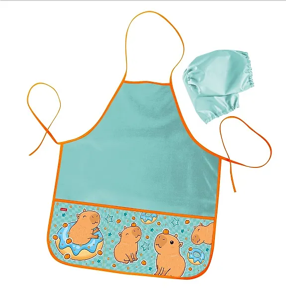 Фартук с двумя карманами рассчитан на возраст от 6 лет, рост ребенка примерно 122-152см. Выполенен из практичного и легко отстирывающегося полиэстера, в комплект входят нарукавники. Размер: 53,5*44,5 см.