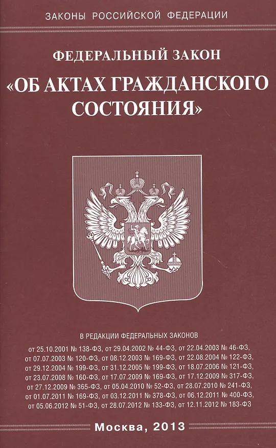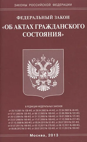Федеральный закон Российской Федерации "Об актах гражданского состояния"/ Федеральный закон от 15 ноября 1997 года № 143-ФЗ (в ред. федеральных законов от 25.10.2001 № 138-ФЗ, от 29.04.2002 № 44-ФЗ, от 22.04.2003 № 46-ФЗ, от 07.07.2003 № 120-ФЗ, от 08.12.2003 № 169-ФЗ, от 22.08.2004 № 122-ФЗ, от 29.12.2004 № 199-ФЗ, от 31.12.2005№ 199-ФЗ. от 18.07.2006 № 121-ФЗ, от 23.07.2008 № 160-ФЗ, от 17.07.2009 № 169-ФЗ, от 17.12.2009 № 317-ФЗ, от 27.12.2009 № 365-ФЗ, от 05.04.2010 № 52-ФЗ, от 28.07.2010 № 241-ФЗ, от 01.07.2011 № 169-ФЗ. от 03.12.2011 №378-Ф3, от 06.12.2011 №400-ФЗ, от 05.06.2012 № 51-ФЗ, от 28.07.2012 № 133-ФЗ, от 12.11.2012 №183-Ф3).