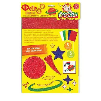 Фетр цветной с голографическими блестками, 5 цв, в пакете с хедером, европодвес 5 пр. А4