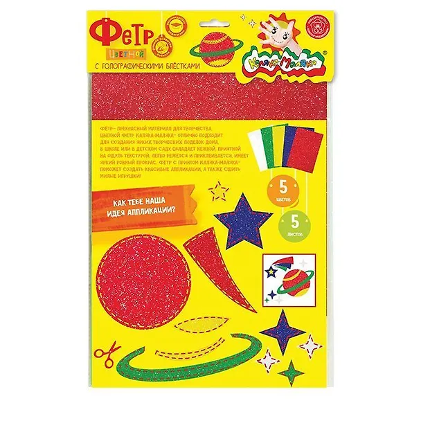 В ассортименте Каляка-Маляка® представлен популярный и востребованный материал для творчества и раннего развития — цветной фетр. Он предназначен для создания ярких творческих поделок дома, в школе или в детском саду.