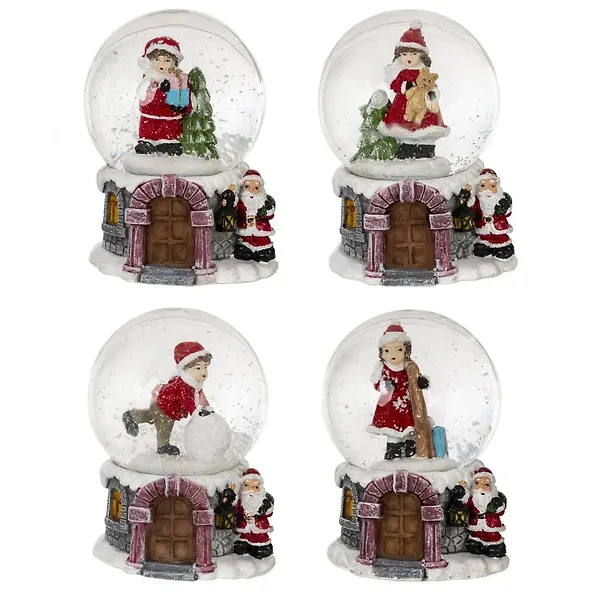 Фигурка декоративная в стеклянном шаре представлена в 4 вариантах. Шар заполнен водой с мелкими белыми хлопьями, имитирующими вьюгу при встряхивании. Фигурка и подставка изготовлены из полимерных материалов. Яркий сувенир станет незабываемым подарком в канун Нового года.
