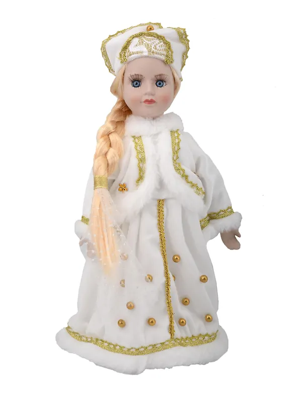 Фигурка Снегурочка (артикул 95183) — это декоративная кукла размером 17,5×20,5×32 см, изготовленная из керамики и текстиля. Она представляет собой образ юной девушки с румянцем на щеках, светлыми волосами, заплетёнными в косу, и выразительными глазами с пышными ресницами. Снегурочка наряжена в роскошную шубку, декорированную тесьмой и блёстками, а её голову украшает кокошник. Кукла установлена на пластиковую подставку, что позволяет разместить её в любом удобном месте.