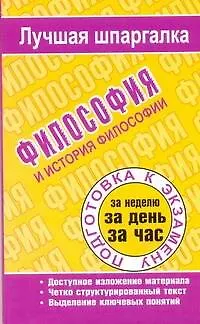 Издание предназначено для студентов высших учебных заведений. Оно может служить пособием при подготовке к экзамену по философии и истории философии. Здесь можно найти ответы на основные экзаменационные вопросы. Форма подачи материала позволяет за короткое время усвоить большой объем информации. Сведения, подробно изложенные в первой части книги, резюмируются на последующих страницах. Нужная вам информация повторяется из раздела в раздел во все более сжатой форме, что облегчает ее запоминание. Обратившись к книге трижды: за неделю, за день и за час до экзамена, вы будете достаточно хорошо ориентироваться в предмете, чтобы успешно сдать экзамен.