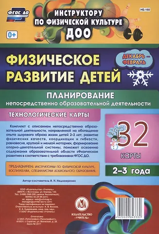 Предложен комплект из 32 карты с описанием НОД на каждое занятие, разработанными на основе ФГОС ДО, который поможет воспитывающим взрослым (воспитателям и родителям) обогатить опыт осознанного отношения к своему здоровью и развить интерес детей 2-3 лет к здоровому образу жизни. Картотека включает задачи, структуру НОД, ОРУ, ОВД, подвижную игру с описанием, пронумерована и предназначена для освоения детьми определенной задачи. Карточное планирование позволяет многократно использовать накопленный материал, по необходимости корректируя его. Предложенный набор табличных форм планирования направлен на развитие физических качеств, координации и гибкости; способствует правильному формированию опорн