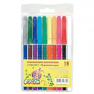 Фломастеры магические Каляка-Маляка позволяют получить 18 цветов из 10 фломастеров. Каждая картинка, нарисованная фломастером и проявленная фломастером-преобразователем, меняет цвет. Магический цвет совпадает с цветом колпачка, а первоначальный цвет -с цветом корпуса. Разработаны для детей в возрасте от 3 лет. Выпускаются в удобном пластиковом блистере с европодвесом. Толщина фломастера 10 мм. Диаметр пишущего наконечника 2 мм. В наборе 10 фломастеров -9 цветных фломастеров и 1 фломастер-преобразователь (в корпусе белого цвета). Фломастеры Каляка-Маляка соответствуют самым высоким мировым стандартам качества и безопасности. Обладают яркими, сочными цветами. Богатая палитра оттенков.Полипроп