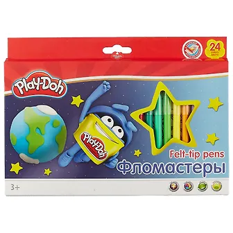 Набор фломастеров 24 цв., раскраска. Размер одного фломастера – 14,9 х 0,86 см (с колпачком). Вентилируемый колпачок. Упаковка картонная коробка с вставкой держателем для фломастеров, европодвес. На корпусе фломастера – тиснение "серебром". Один ряд фломастеров. Размер 18,5 х 26 х 1,2 см. Play Doh