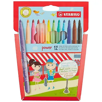 Фломастеры STABILO power могут оставаться без колпачка 8 недель, не теряя своих свойств. Усиленный износостойкий наконечник диаметром 2мм выдерживает повышенные нагрузки при рисовании и раскрашивании, устойчив к любой силе нажима, сохраняет свою форму и равномерно наносит чернил. Фломастеры рисуют яркими насыщенными цветами. Чернила на водной основе не имеют запаха и легко отстирываются с ткани и смываются с рук. Рисунки не выцветают со временем. Фломастеры соответствуют всем требованиям безопасности, имеют вентилируемый колпачок и не токсичны. Являются обладателями Европейского сертификата качества (маркировка на корпусе СЕ), что подтверждает их высочайшее качество и безопасность для здоровья. Служат 5 лет. STABILO (Германия) основана в 1855г. и известна как производитель первоклассных принадлежностей для письма и рисования. Если Вам нужно немного вдохновения, помощи в учебе, ручки для левшей или обучения письму, что-то модное или вы хотите заняться творчеством - используйте STABILO.